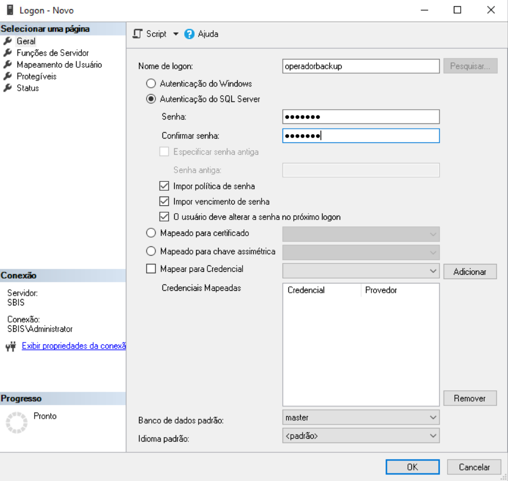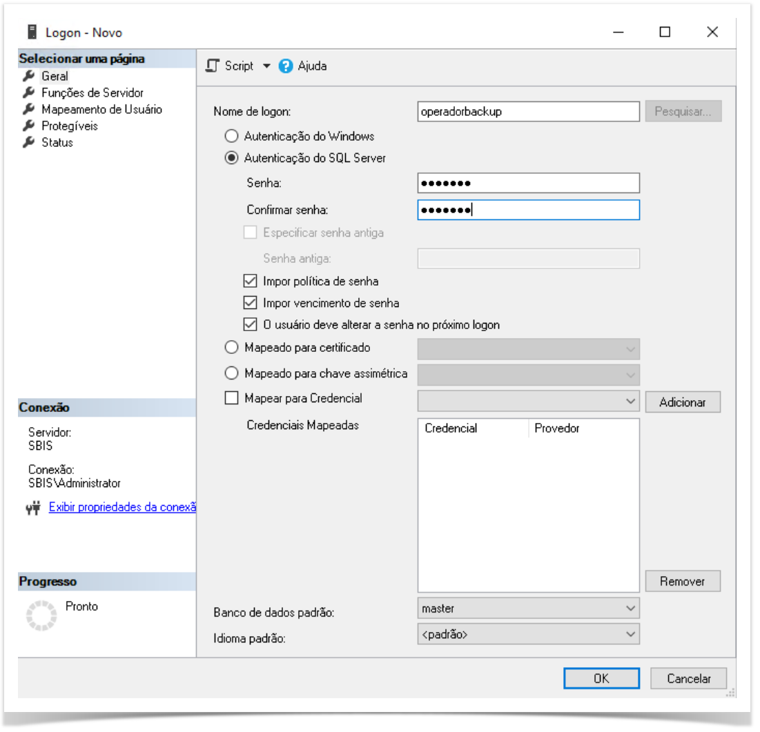 . Pronto, esse usuário e senha poderá realizar backups e restaurações diretamente pelo Banco de Dados SQL Server.