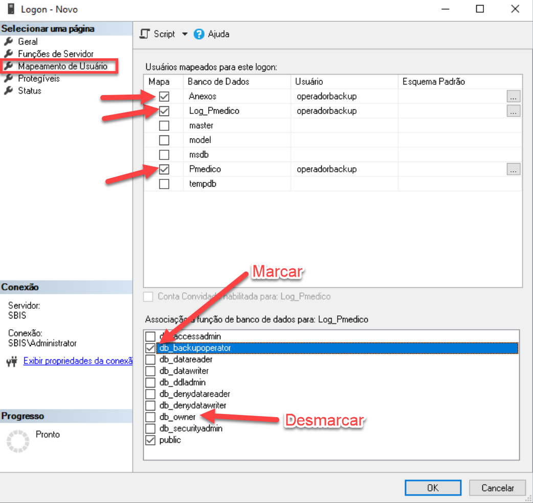 Nas opções de cada abaixo, desmarque a opção db_owner e marque a opção db_backupoperator.