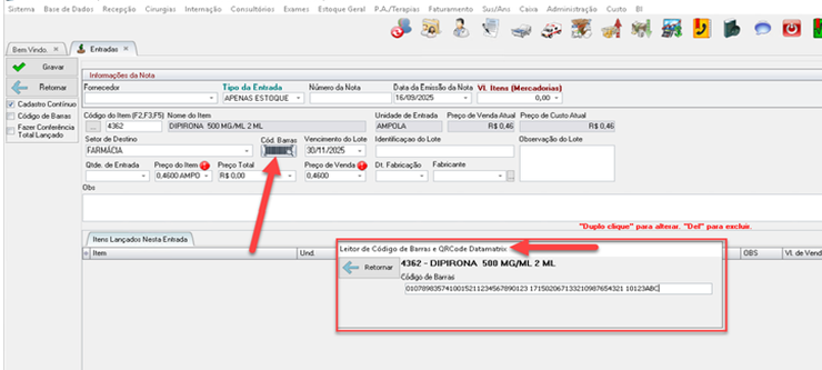 - Ao incluir o item, clicar no campo “Cod. Barras”.