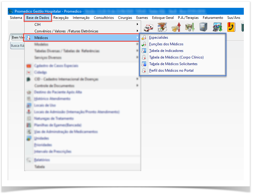 Para ter acesso ao menu "Médicos", clique no menu "Base de Dados" e depois na opção "Médicos".
