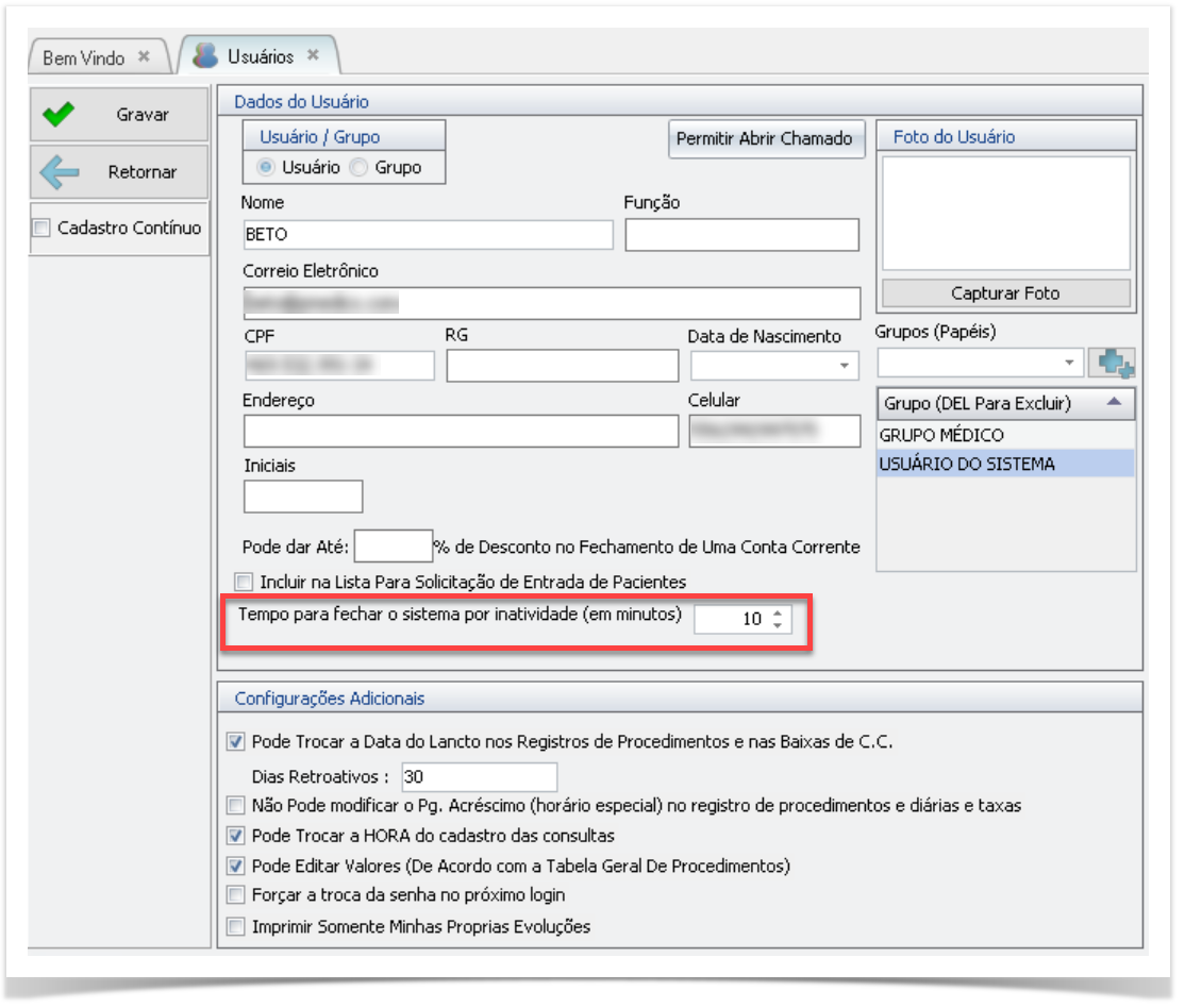 É possível definir o tempo de inatividade em minutos para o sistema pedir a senha novamente para o usuário