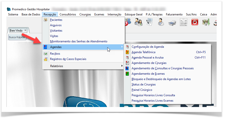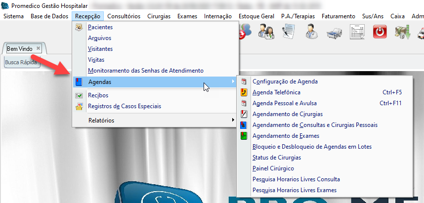 No menu de Agendas temos atalhos para todas as agendas do sistema e algumas opções úteis para as rotinas do departamento de agendamento que serão detalhadas a seguir.