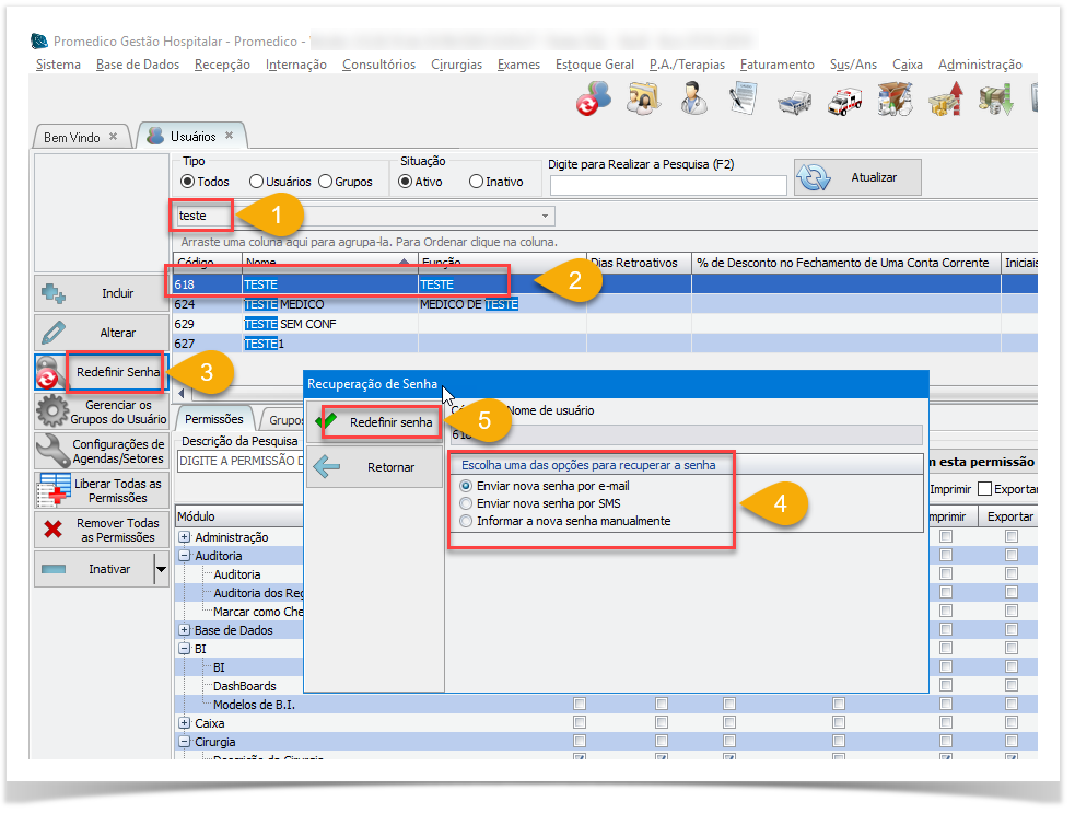 O sistema fornece basicamente três formas de se redefinir a senha de um usuário. São elas: