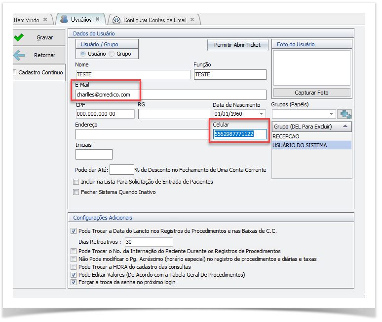 Para que as funções de redefinição de senha por email e por SMS possam funcionar adequadamente, é necessário que o usuário possua email e número de telefone celular devidamente informados em seu cadastro.