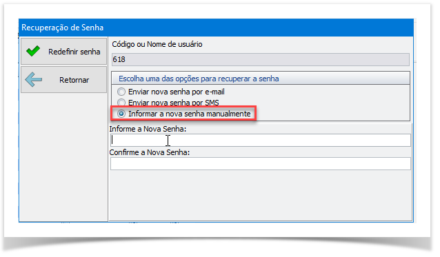 6. Caso selecione a última opção ("Informar a nova senha manualmente"), o sistema abrirá os campos para que o usuário possa digitar a nova senha imediatamente.