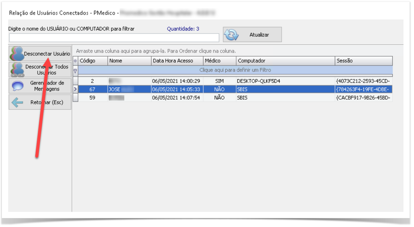 Ao abrir a tela selecione o usuário desejado e clique em Desconectar Usuário.