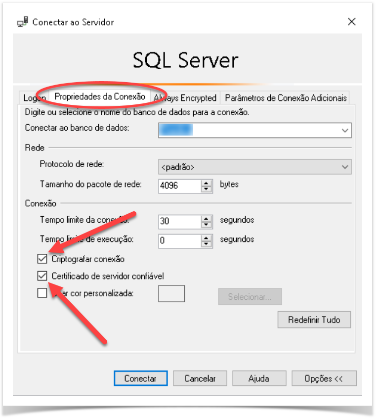 - Na guia Propriedades da Conexão, marque a caixa de seleção Criptografar a conexão e Certificado de servidor confiável.