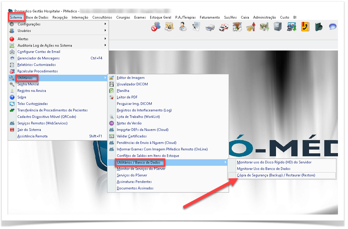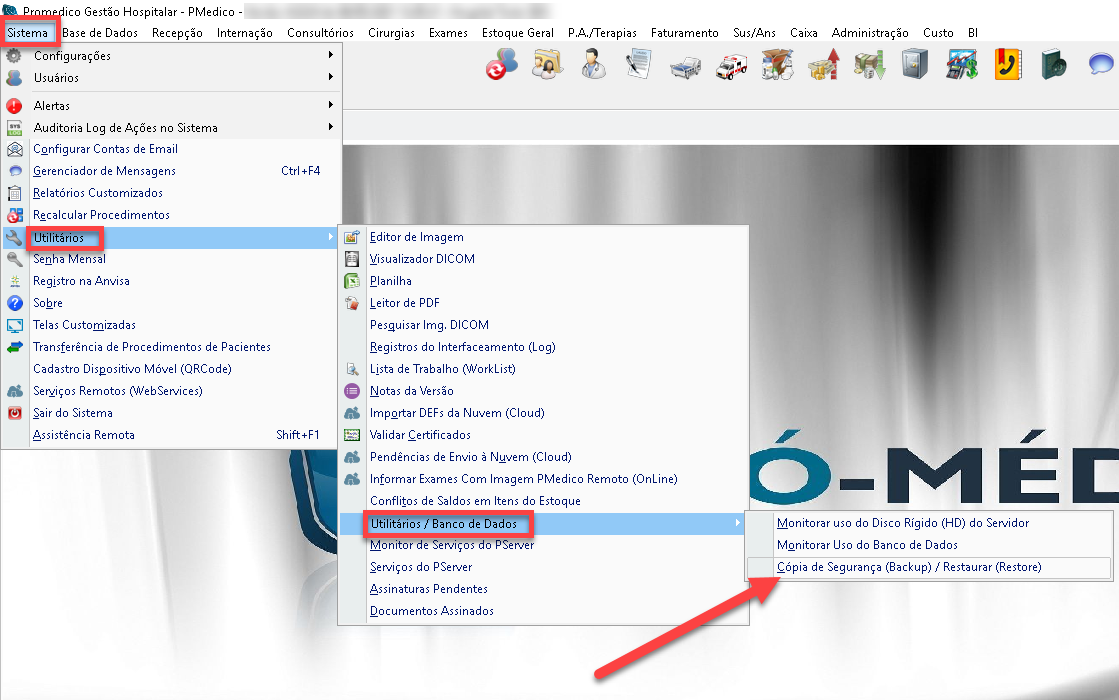 Acesse o menu Sistema, depois Utilitários, Utilitários / Banco de Dados e em seguida Cópia de Segurança (Backup) / Restaurar (Restore)