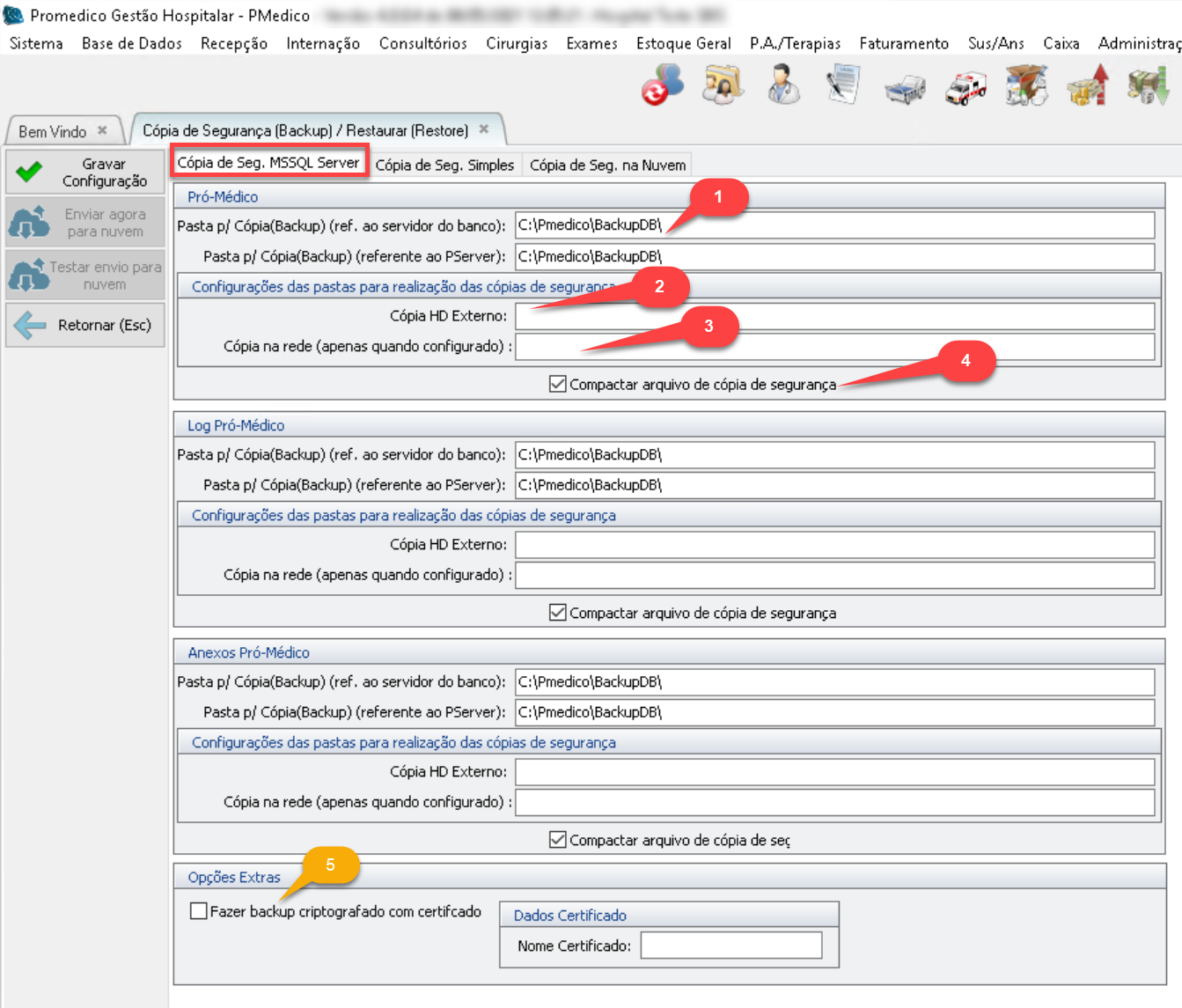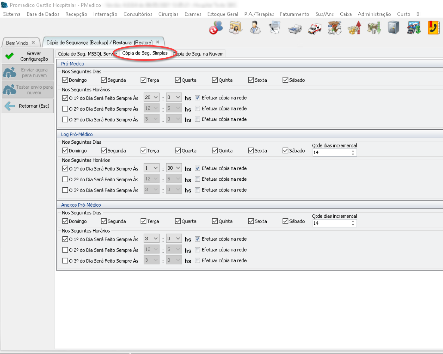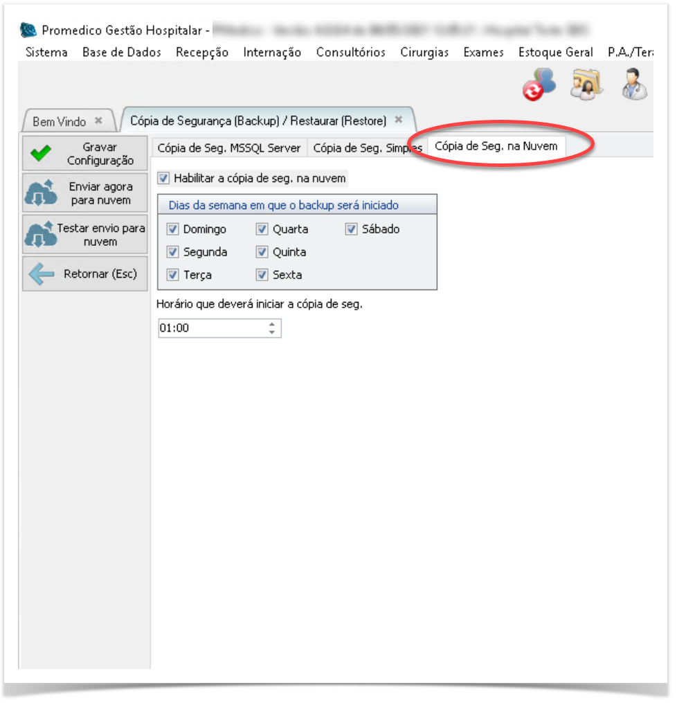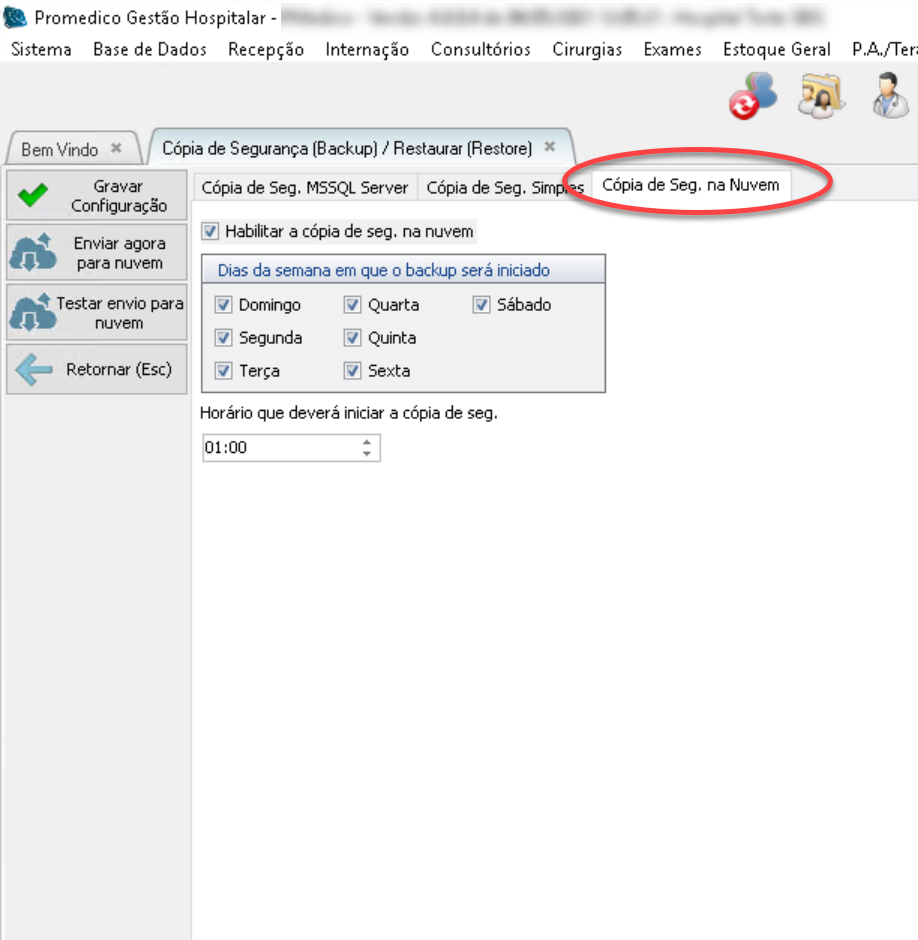 Ao marcar essa opção, nos dias e horários selecionados, será feita uma copia do backup para a nuvem (cloud) do Promedico garantindo uma segurança extra em caso de perda de todos os dados do hospital.