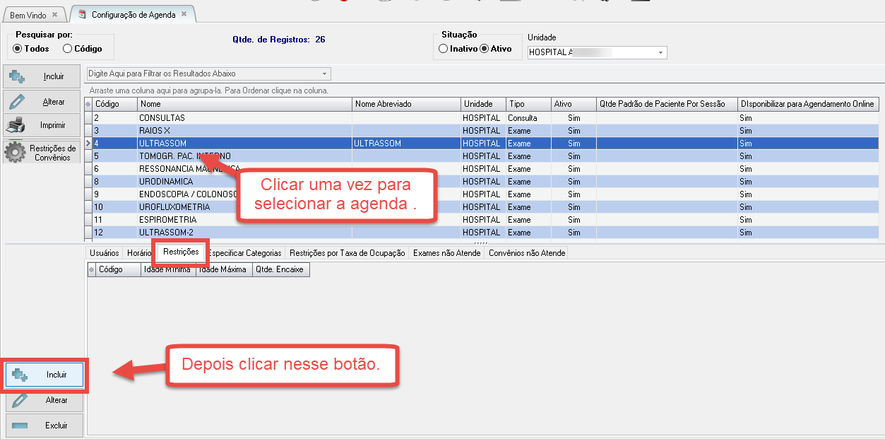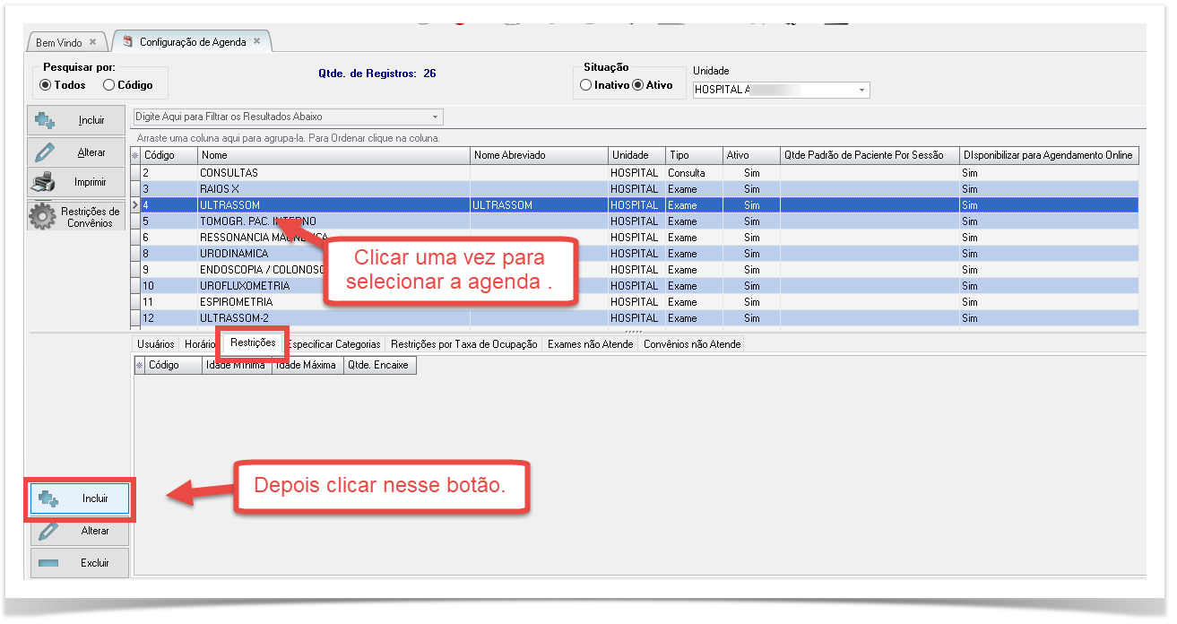 É possível configurar para que uma agenda atenda pacientes dentro de um limite mínimo e máximo de idade. Para isso basta estar na tela de Configuração de Agendas com a agenda selecionada e clicar na aba Restrições e depois no botão Incluir: