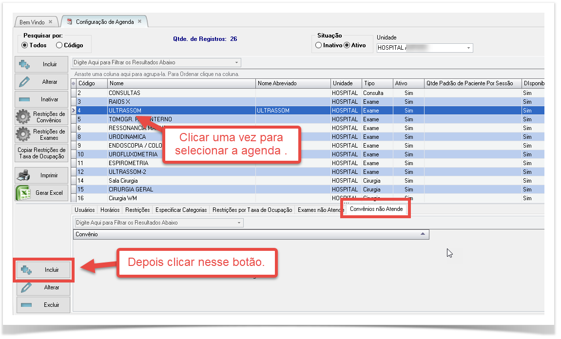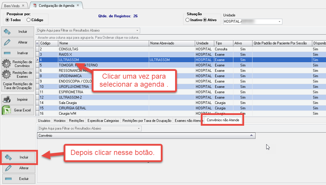 1. Para começar a configurar essa restrição é necessário estar na tela de Configuração de Agendas com a agenda selecionada e clicar na aba Convênio Não Atende e depois no botão Incluir: