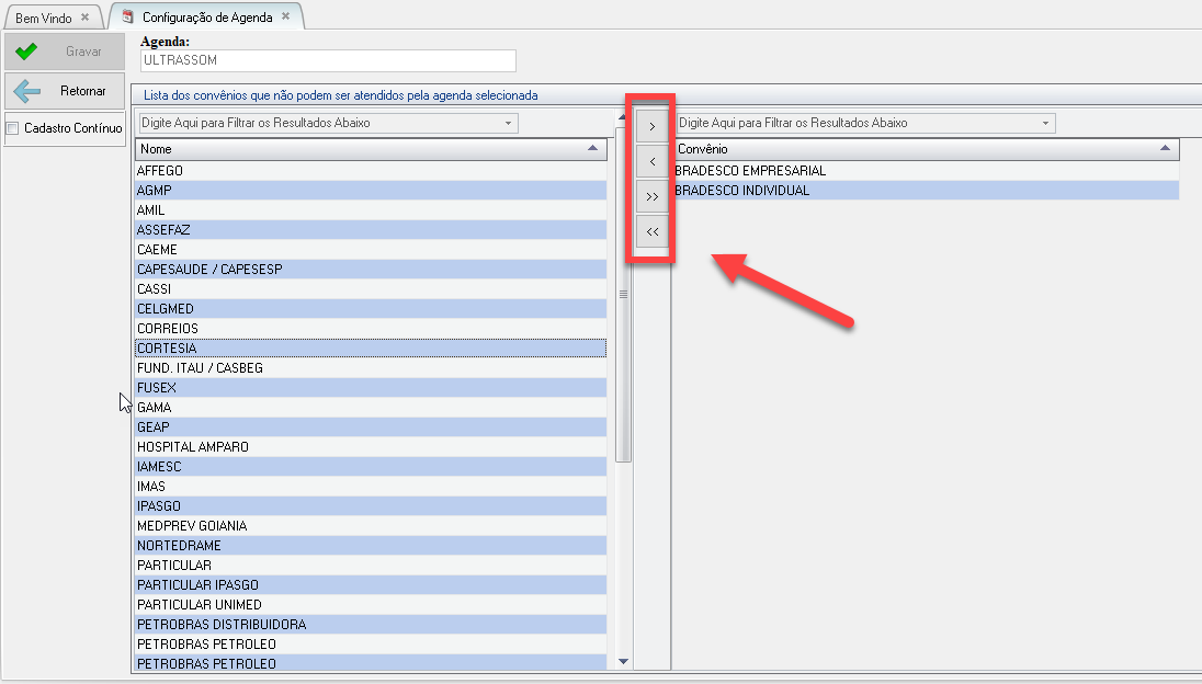 Da forma que a regra acima foi criada a agenda irá atender todos os convênios (que estão do lado esquerdo), exceto os convênios BRADESCO (que estão do lado direito).