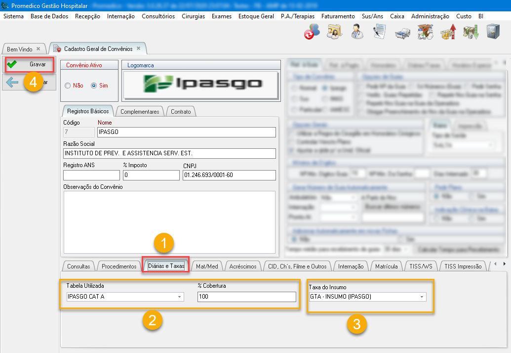 3. Para o convênio/plano saúde do Estado de Goiás (Ipasgo), há ainda uma configuração extra, denominada "Taxa de Insumo", que deve ser lançada em situações específicas de atendimento ao paciente.