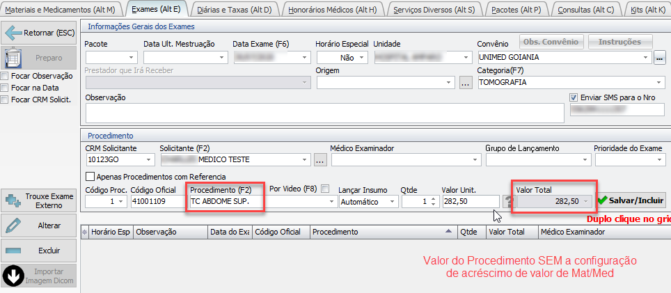 a) Exemplo de lançamento de uma TC de Abdome Superior NÃO configurada para acrescentar o valor dos Mat/Meds.
