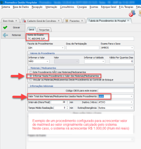 Caso o procedimento tenha sido cadastrado no sistema com a opção  marcada, seu respectivo valor referente ao(s) mat/med(s) informado e, a caixa de seleção mencionada acima esteja marcada (é necessário que estas condições sejam satisfeitas), então, no momento do lançamento deste procedimento para um paciente, o sistema irá lançar o procedimento com seu valor original acrescido do valor correspondente aos mat/meds informado no cadastro do procedimento.