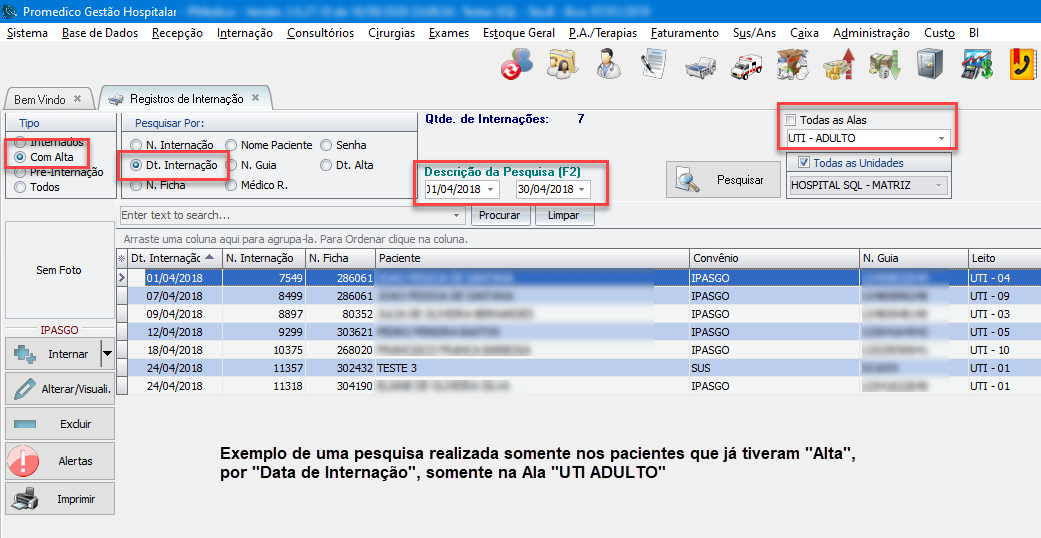 b) Com Alta: Faz com que a pesquisa seja limitada somente a registros de pacientes que já receberam "alta", ou seja, que não estão mais "internados" no hospital.