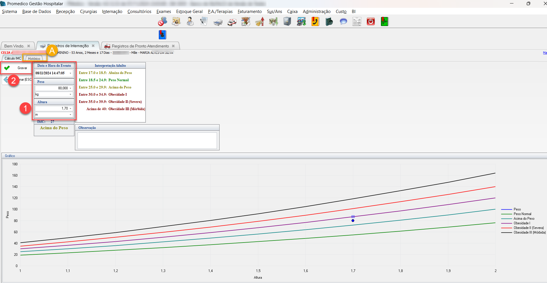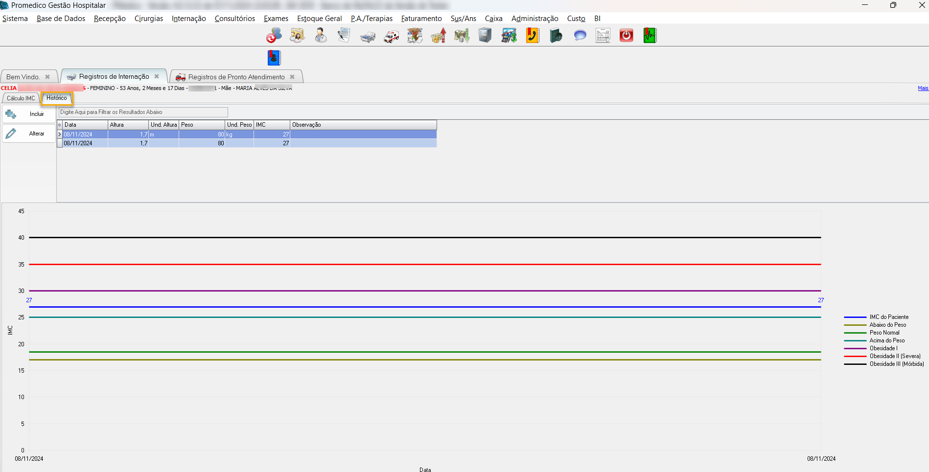 Após gravar o registro de IMC, o sistema retornará automaticamente para a tela principal de Internação ou de Pronto Atendimento, dependendo do caso.