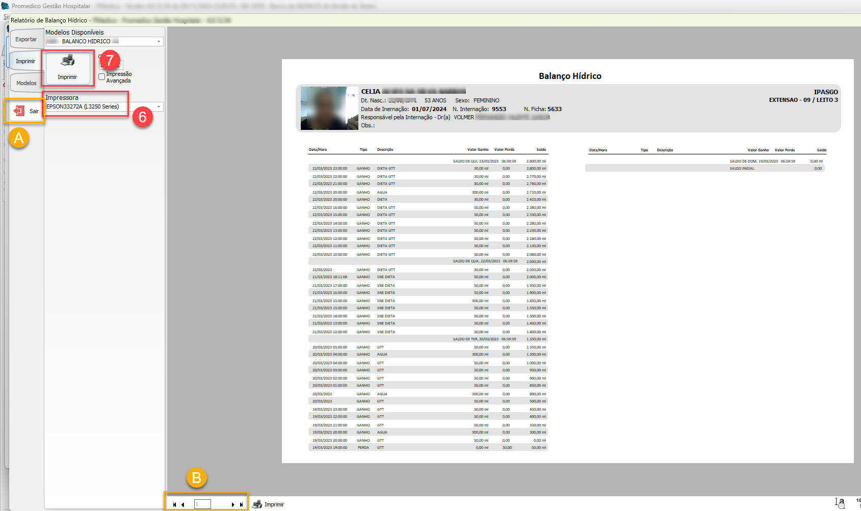 O processo para se localizar e imprimir os registros de Balanço Hídrico é idêntico tanto para pacientes internados, quanto para pacientes do Pronto Atendimento, diferenciando-se apenas em relação à Tela do sistema onde se deseja imprimir o registro.
