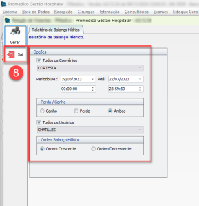 8) Após a impressão realizada (ou caso o usuário tenha clicado no botão "Sair" na tela de impressão, o sistema retornará automaticamente para a janela de filtros. Clique no botão "Sair" para retornar para a tela principal do Balanço Hídrico.