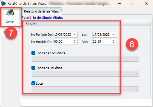 6) Será aberta a janela para seleção das opções de filtragem do relatório. Marque as opções conforme desejado.