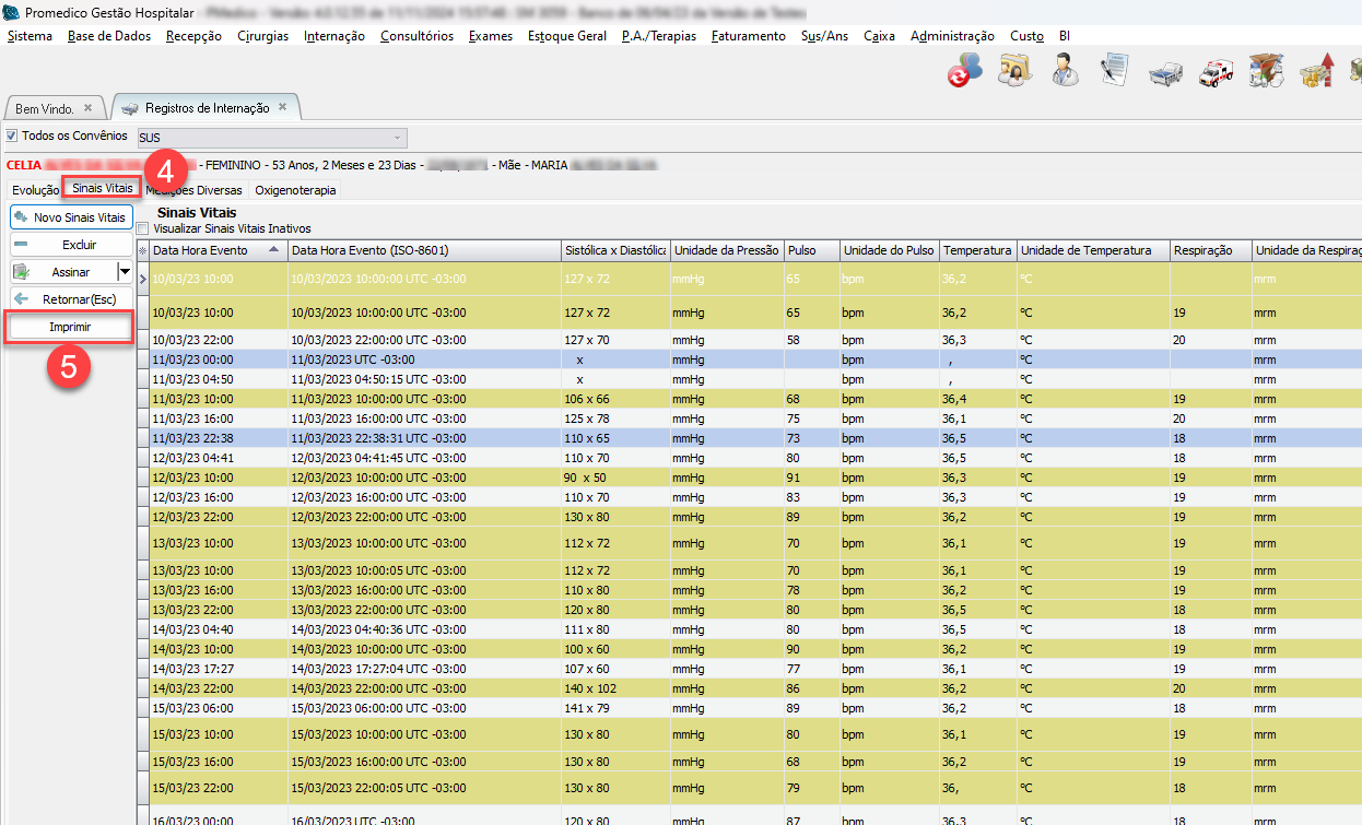 4) Após a abertura da tela, caso não esteja posicionado na aba "Sinais Vitais", clique nela. O sistema listará abaixo os respectivos registros d.