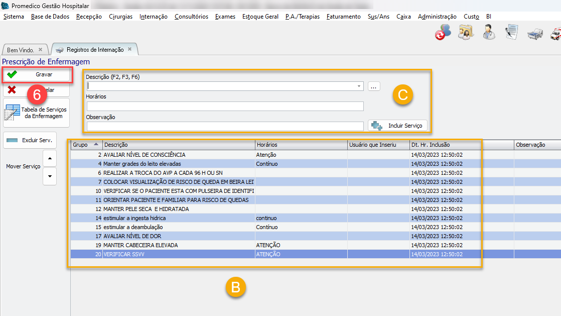 6) Clique no botão "Gravar" para salvar os dados e retornar para a tela de prescrições de enfermagem.