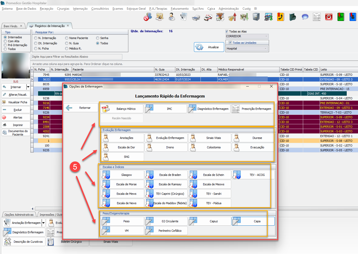 Esta tela foi especificamente desenvolvida com intuito de agrupar, em um lugar só, todas as telas relacionadas às atividades de Enfermagem, dessa forma agilizando o trabalho de registro dos lançamentos.