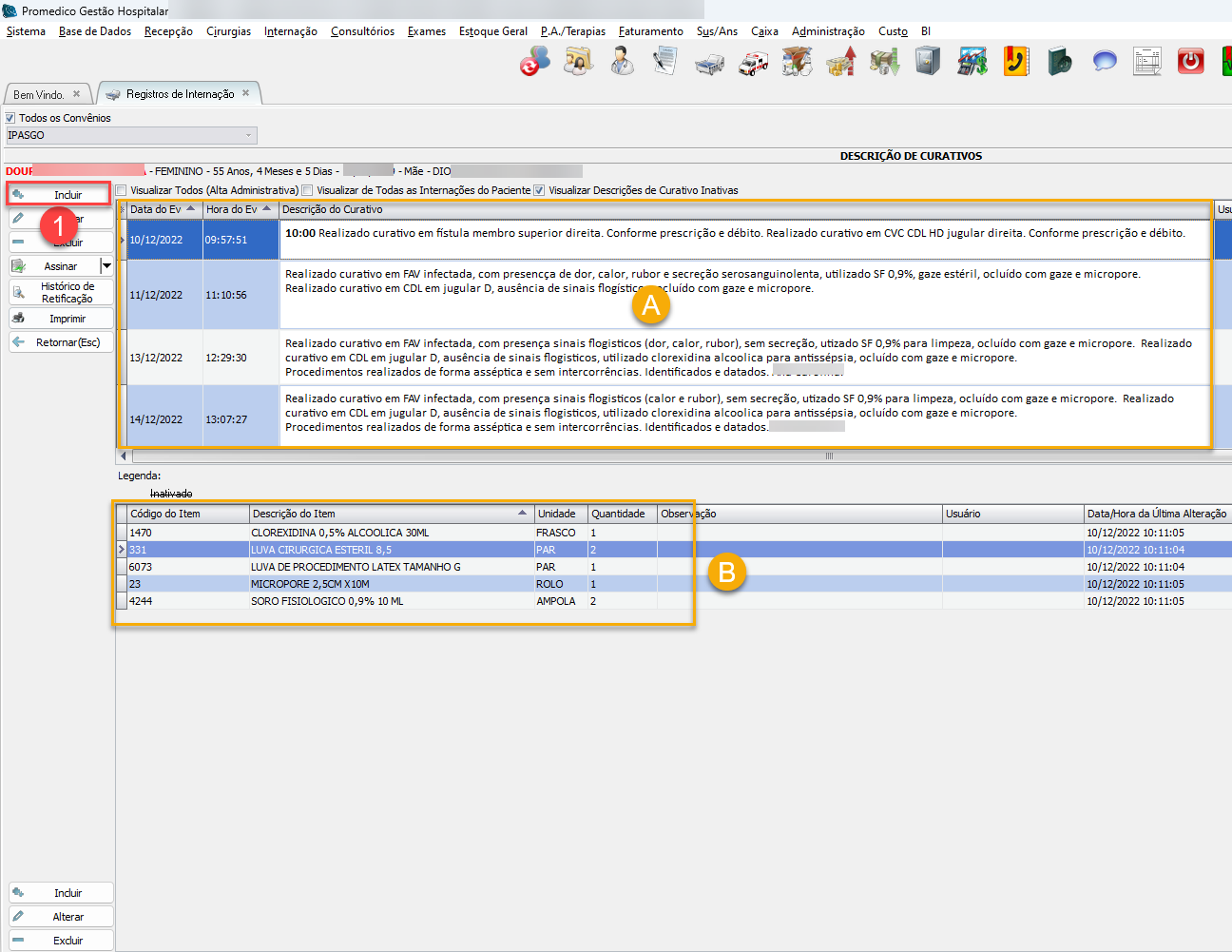 Note que, ao selecionar um dos registros no grid superior, o sistema irá mostrar a lista de medicamentos e materiais utilizado, conforme ilustrado no quadro "B", caso tenham sido lançados.