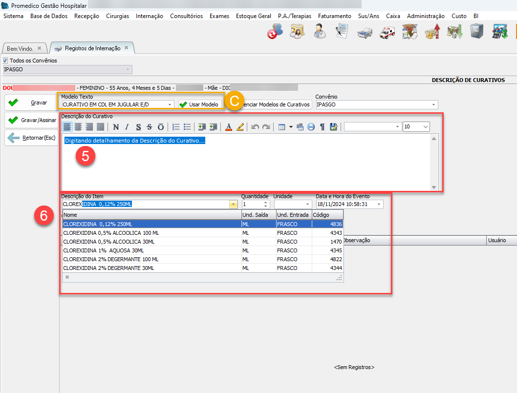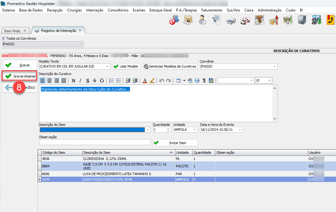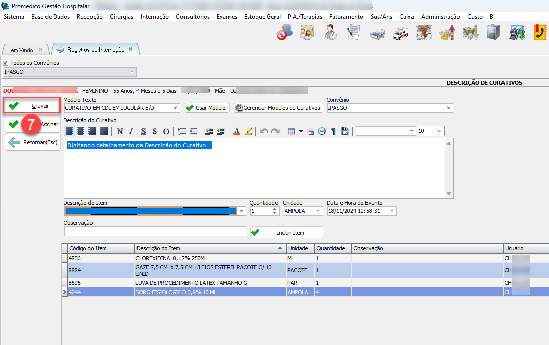 7) Após concluir a digitação, o registro de Curativo poderá ser salvo.