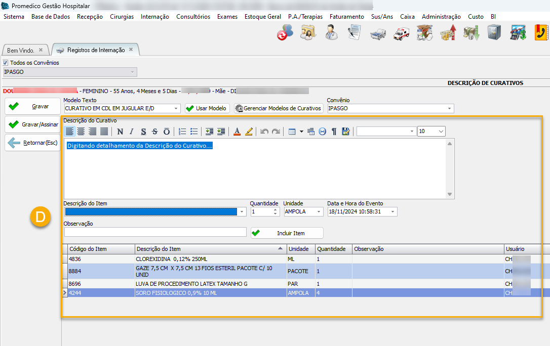 Veja na imagem abaixo (quadro "D") a ilustração de como ficaria uma Descrição de Curativo com medicamentos e materiais lançados.