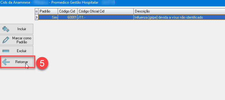 5) O sistema listará o CID escolhido na janela a seguir. Basta clicar em "Retornar" para voltar para a tela da Anamnese.