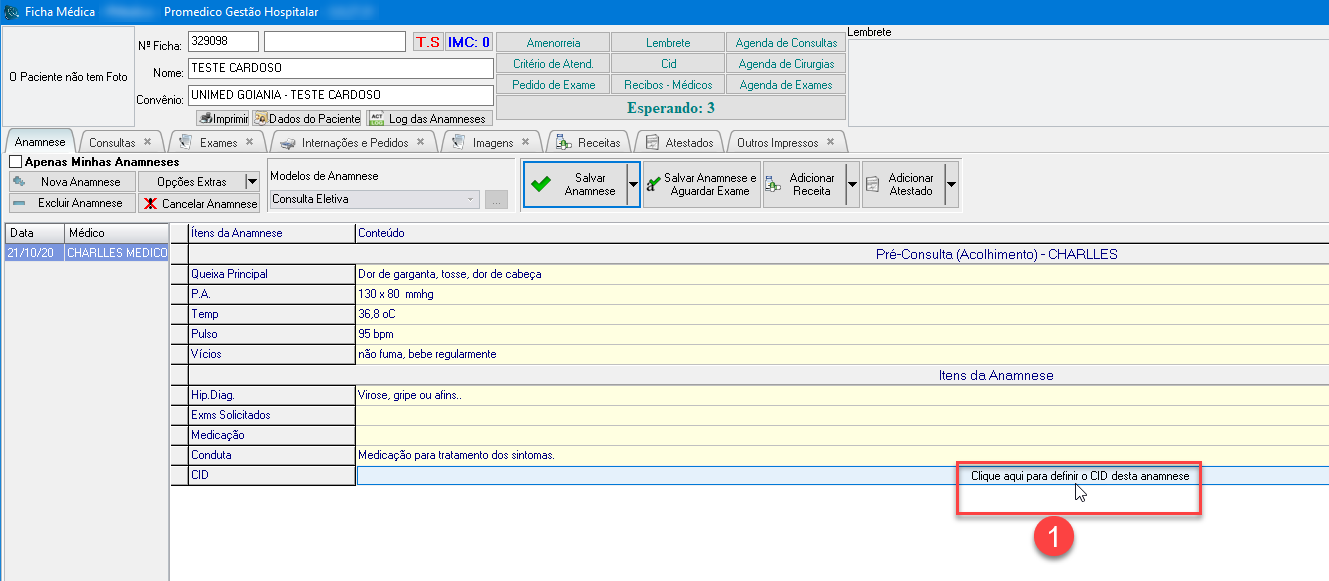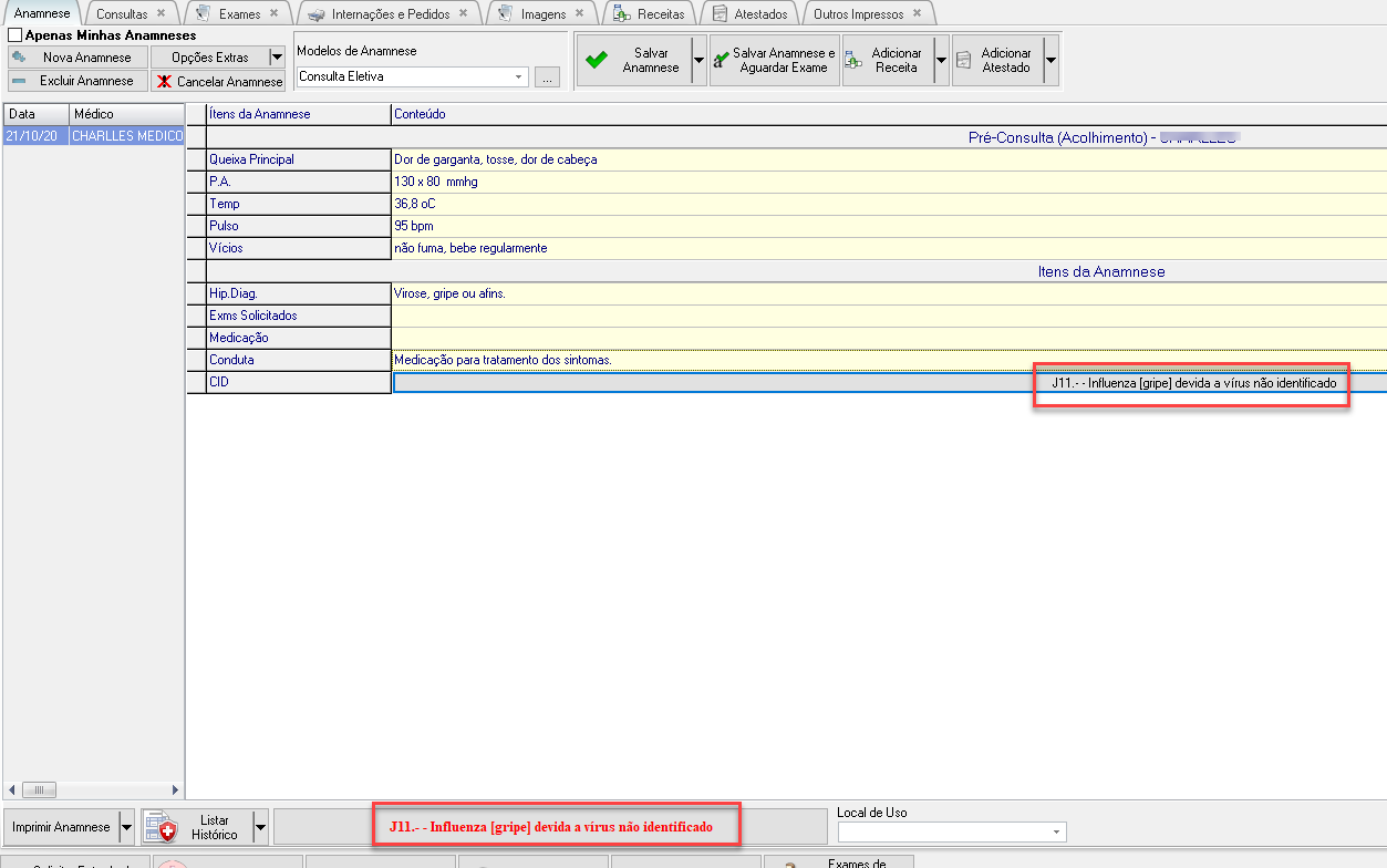 6) Após voltar para a tela da Anamnese, veja que o CID agora está preenchido em seu respectivo campo.