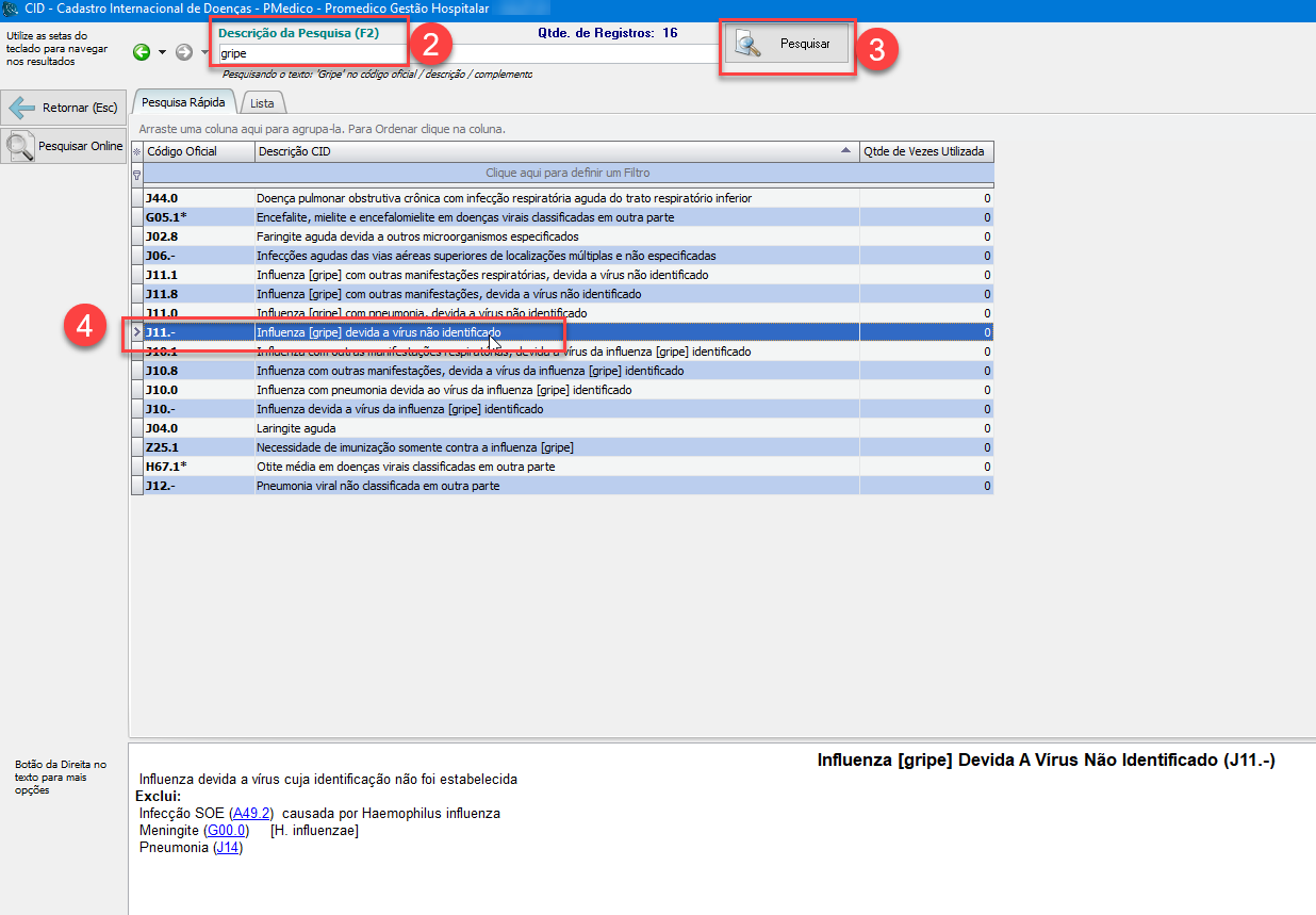 Caso não encontre nenhuma correspondência, tente digitar algum outro termo que imagine fazer parte da descrição do CID desejado. Continue este ciclo até encontrar o resultado desejado.