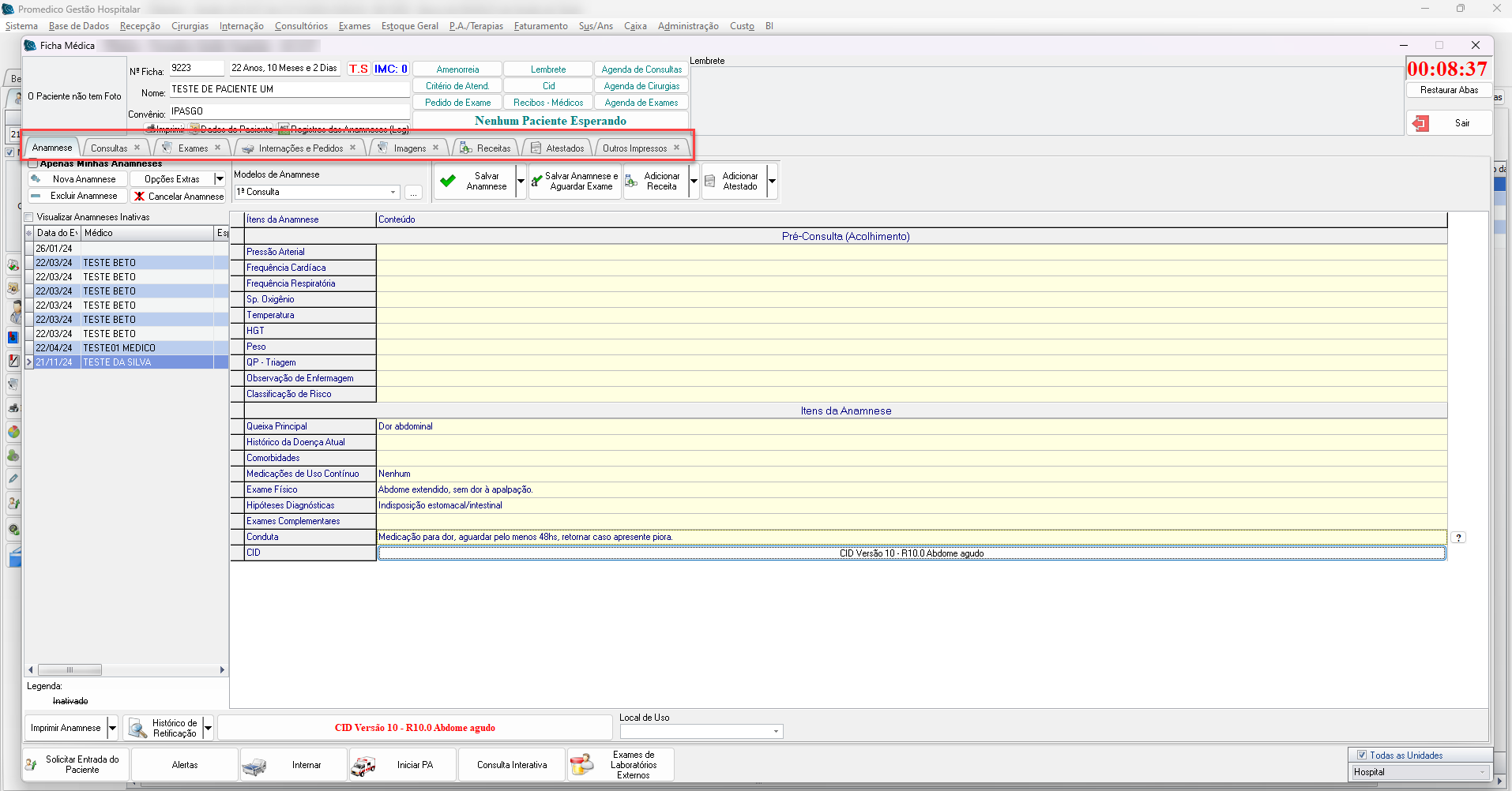 Demonstrar os recursos presentes na tela "Prontuário do Paciente" (ou "Prontuário Médico"), na qual podem ser registradas as anamneses, visualizar as filas de atendimentos de consultas e também de exames, visualizar as agendas do médico, solicitar entrada de pacientes, visualizar estatísticas de tempos médios de espera e atendimento, entre diversos outros recursos.