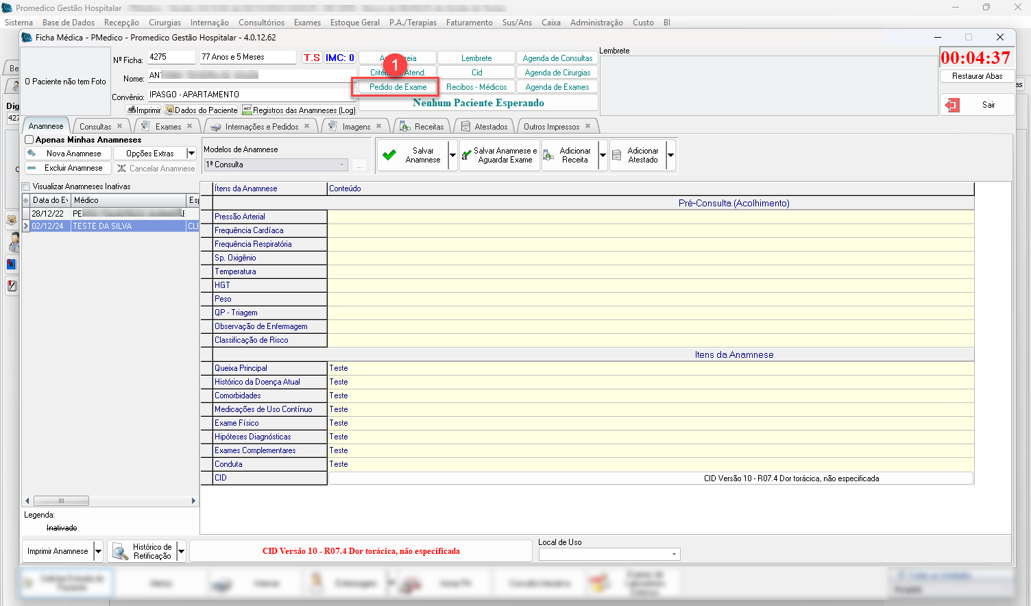 Após acessar a Ficha Médica do paciente através do botão "Prontuário Médico", estarão disponíveis vários recursos e ferramentas para auxiliar o médico a organizar e registrar o atendimento ao paciente, dentre eles, o "Pedido de Exame".