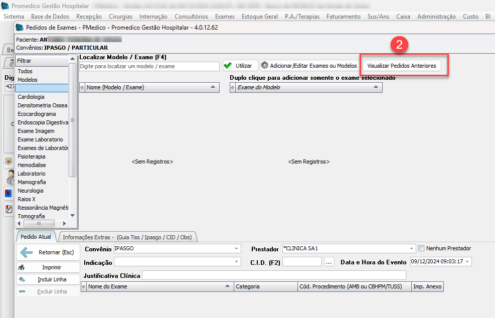 2) Clique no botão "Visualizar Pedidos Anteriores". O sistema então abrirá a tela de pedidos anteriores do paciente, na qual ficam armazenados todos os pedidos que já foram cadastrados para o paciente.