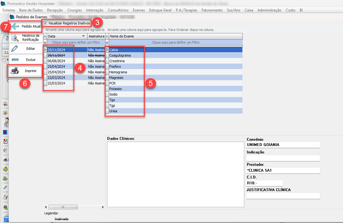 5) Os exames correspondentes ao registro selecionado serão listados no quadro (5).