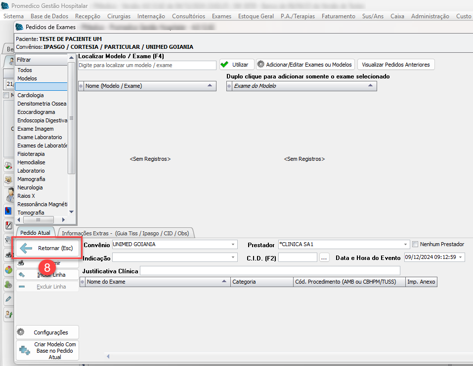 8) De volta à tela principal de pedidos de exames, clique no botão "Retornar (ESC)" para voltar à tela de prontuário do paciente.