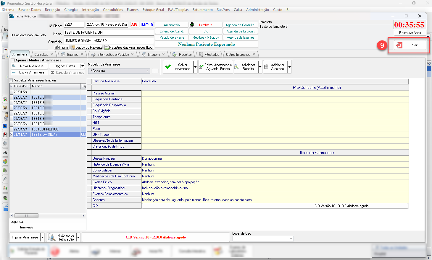 9) Finalmente, na tela de Prontuário, clique no botão "Sair" para fechar o prontuário do paciente e retornar para a tela principal de Fichas Médicas.