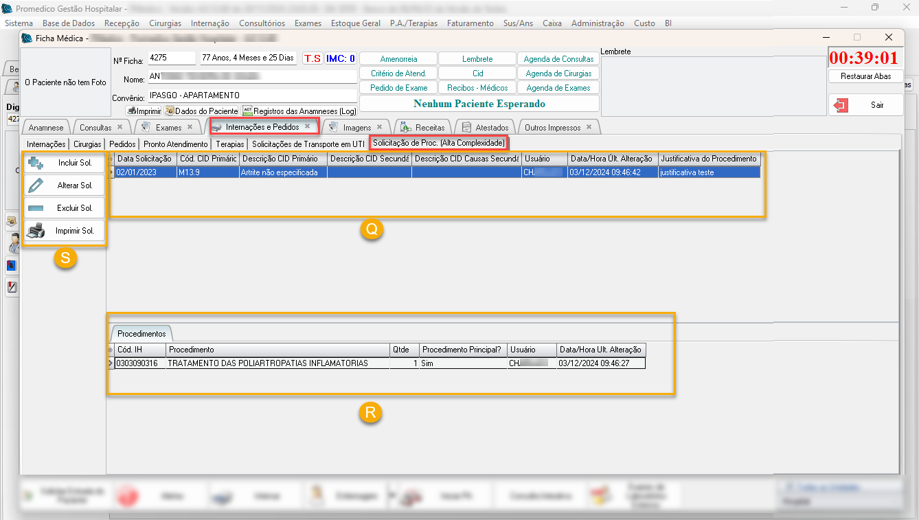 R | Grid "Procedimentos" | Neste "grid", serão listados os procedimentos solicitados. É possível informar 1 procedimento principal, 1 procedimento secundário, e mais 4 outros procedimentos. |