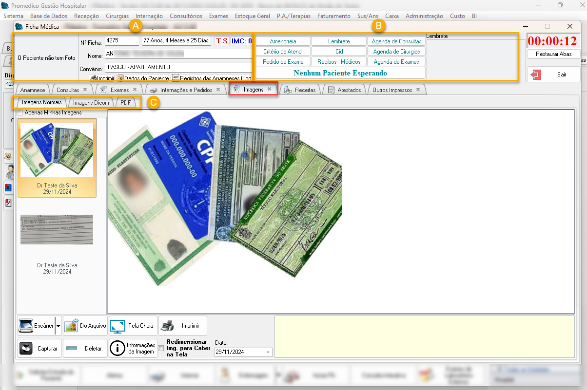 A | Foto do paciente | Este componente mostra a foto do paciente, caso tenha sido armazenada pela recepção no momento da inclusão da ficha cadastral. |