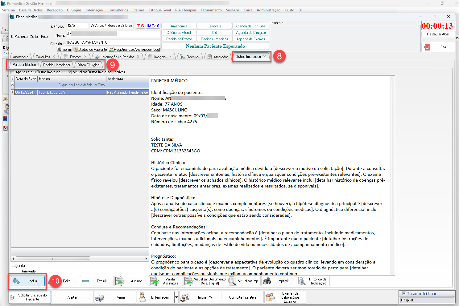 Demonstrar de forma prática como criar um documento ou relatório médico, como por exemplo, "parecer médico", "risco cirúrgico", etc.
