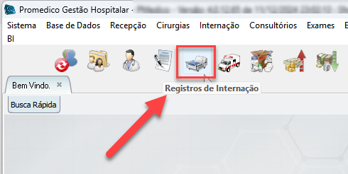 Opcionalmente, a tela "Registros de Internação" também pode ser acessada a partir do ícone , na barra de atalhos superior, conforme mostrado abaixo.