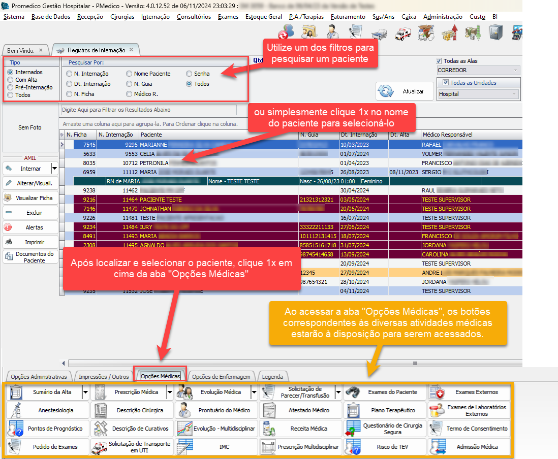 Por padrão, o sistema já abre a tela de internação trazendo todos os pacientes internados no momento.