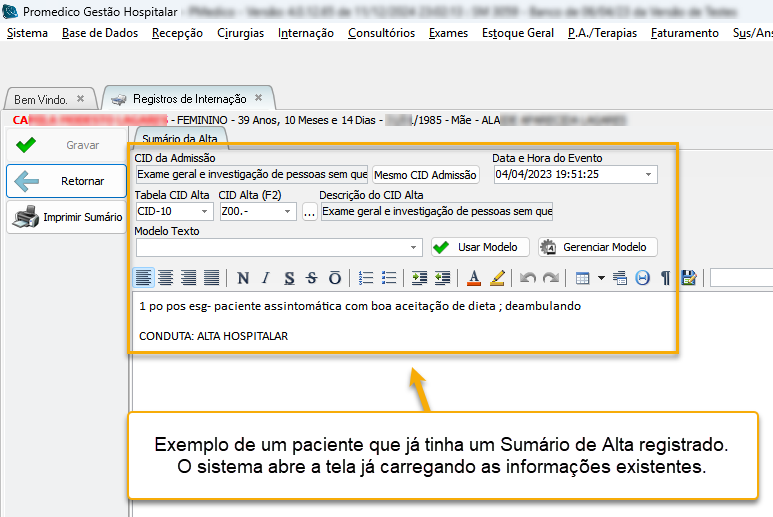 Caso o paciente já possua um Sumário de Alta registrado anteriormente, o sistema irá abrir a tela já carregando as informações existentes.