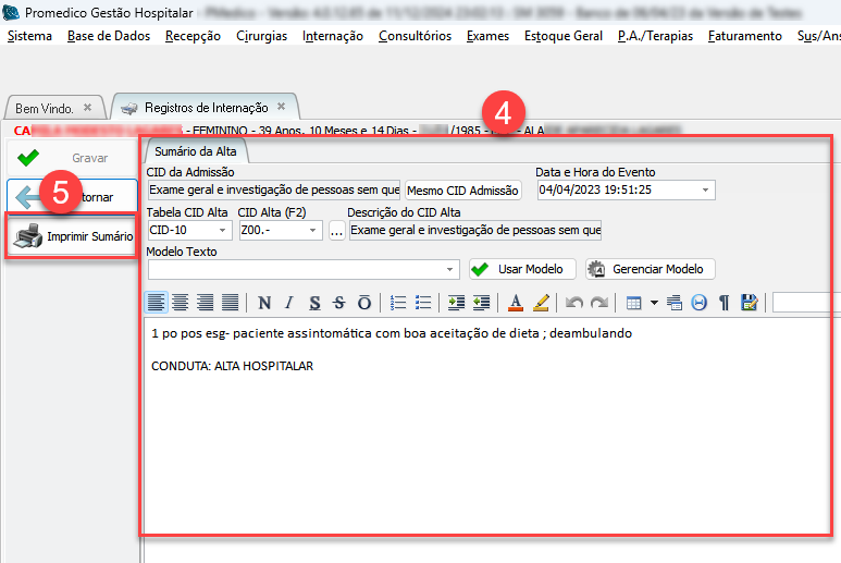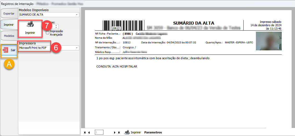 Após o documento ter sido enviada para a impressora (ou caso o usuário clique no botão "Sair"), o sistema retornará automaticamente para a tela principal do Sumário de Alta.