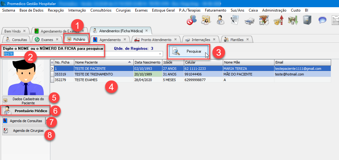 2) Digite o número da ficha do paciente, ou simplesmente uma parte do nome dele.