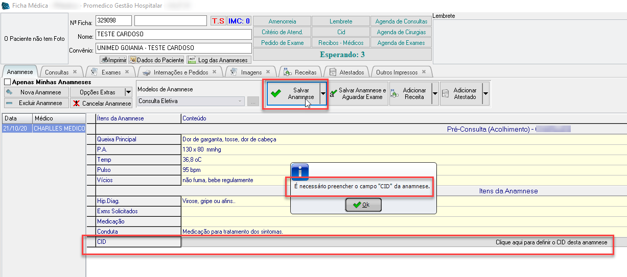 Caso o modelo de Anamnese contenha a "tag" (campo) "CID", e este tenha sido configurado como campo obrigatório, ao tentar salvar a anamnese, o sistema irá solicitar o preenchimento do mesmo antes de efetivar o salvamento.