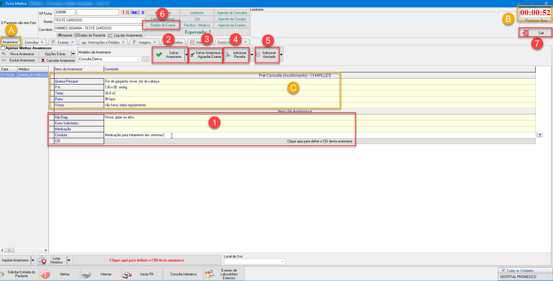 B) No canto superior direito da tela, o sistema mostra um cronômetro que contabiliza o tempo de duração da anamnese. Este é iniciado a partir do momento em que o médico entra nesta tela, e é travado automaticamente ao sair. Pode ser útil caso o médico precise saber quanto tempo está durando a consulta com o paciente.