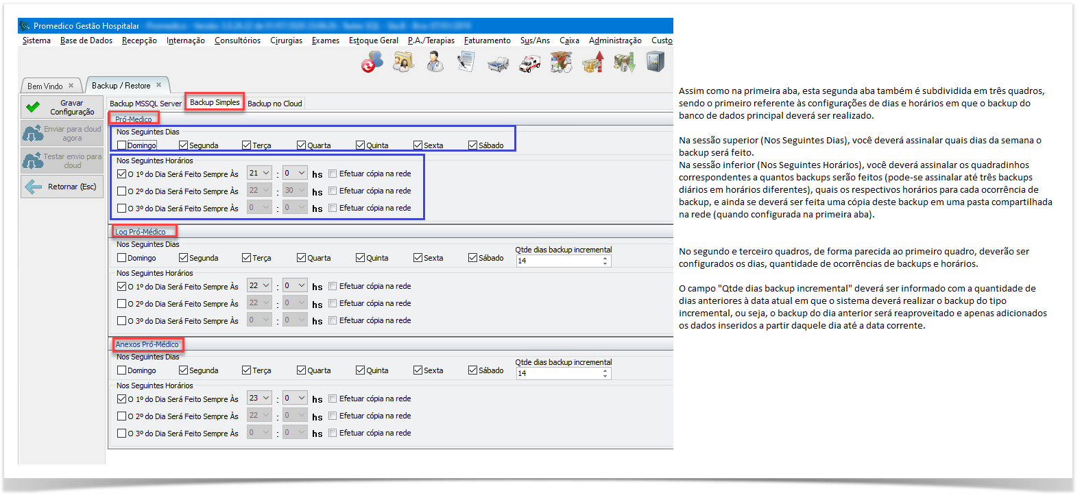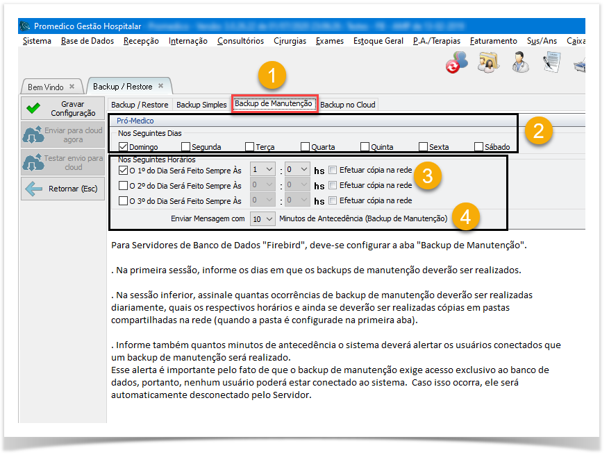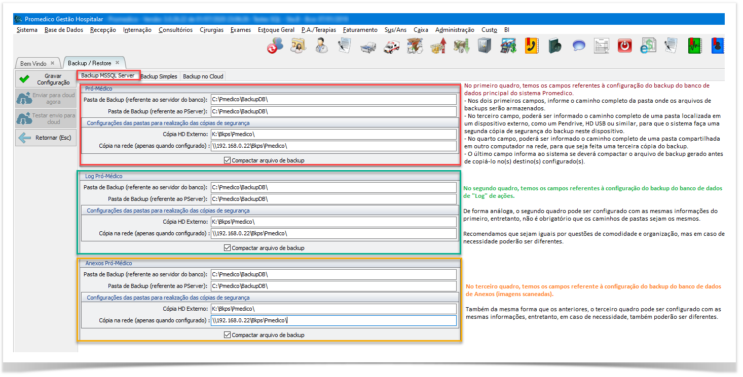 Basicamente, o sistema Promedico possui três Bancos de Dados principais, que podem ser configurados de maneira independente, podendo inclusive, atribuir pastas, dias e horários diferentes para cada um.